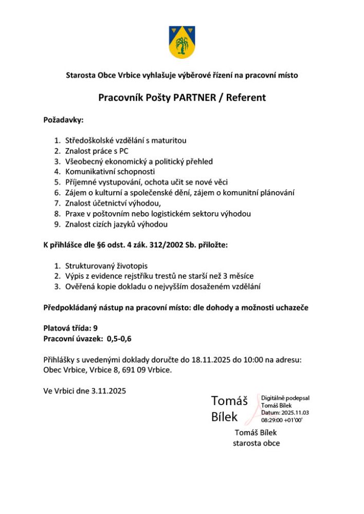 Výběrové řízení - Pošta partner a referent Vrbice